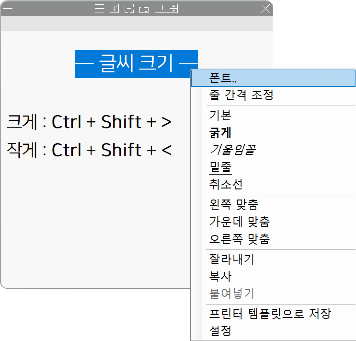 오른쪽 마우스를 클릭하여 폰트를 선택해주세요. 폰트 종류 및 크기를 변경할 수 있습니다.