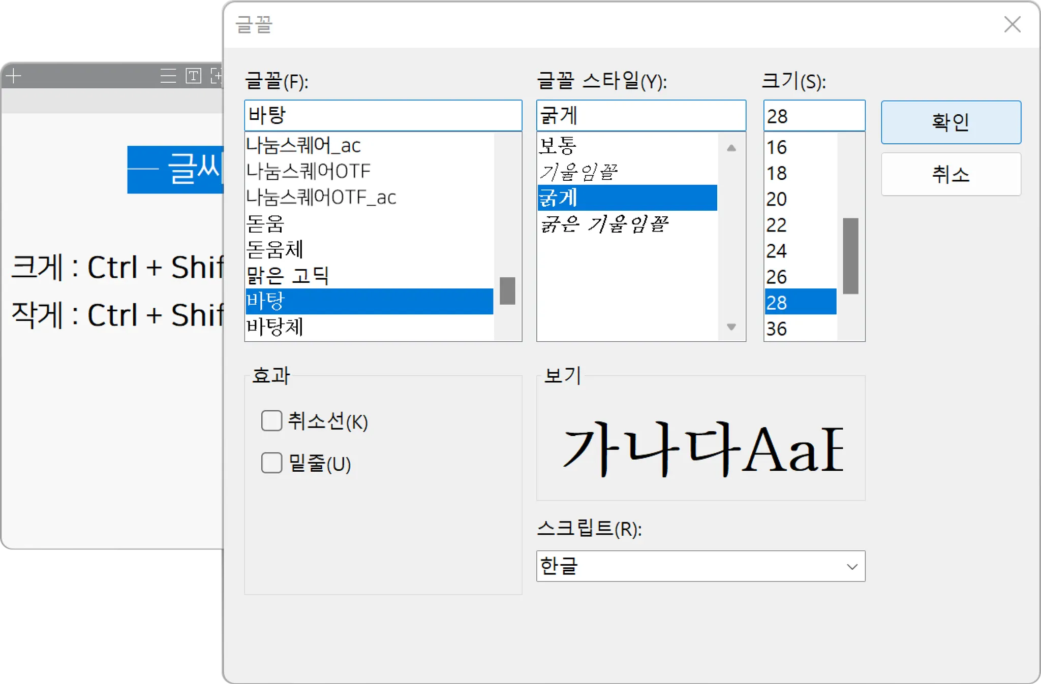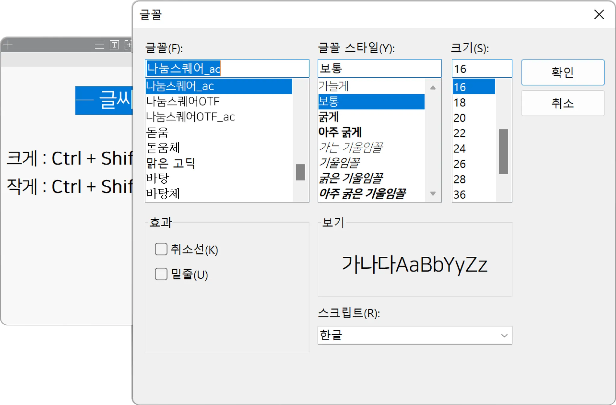 ▲ 글꼴 창에서 글꼴, 스타일, 크기 변경 가능