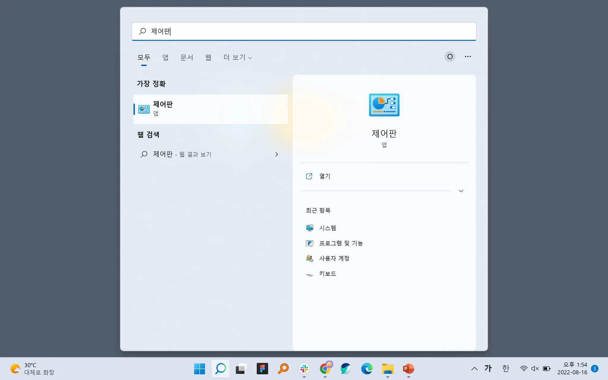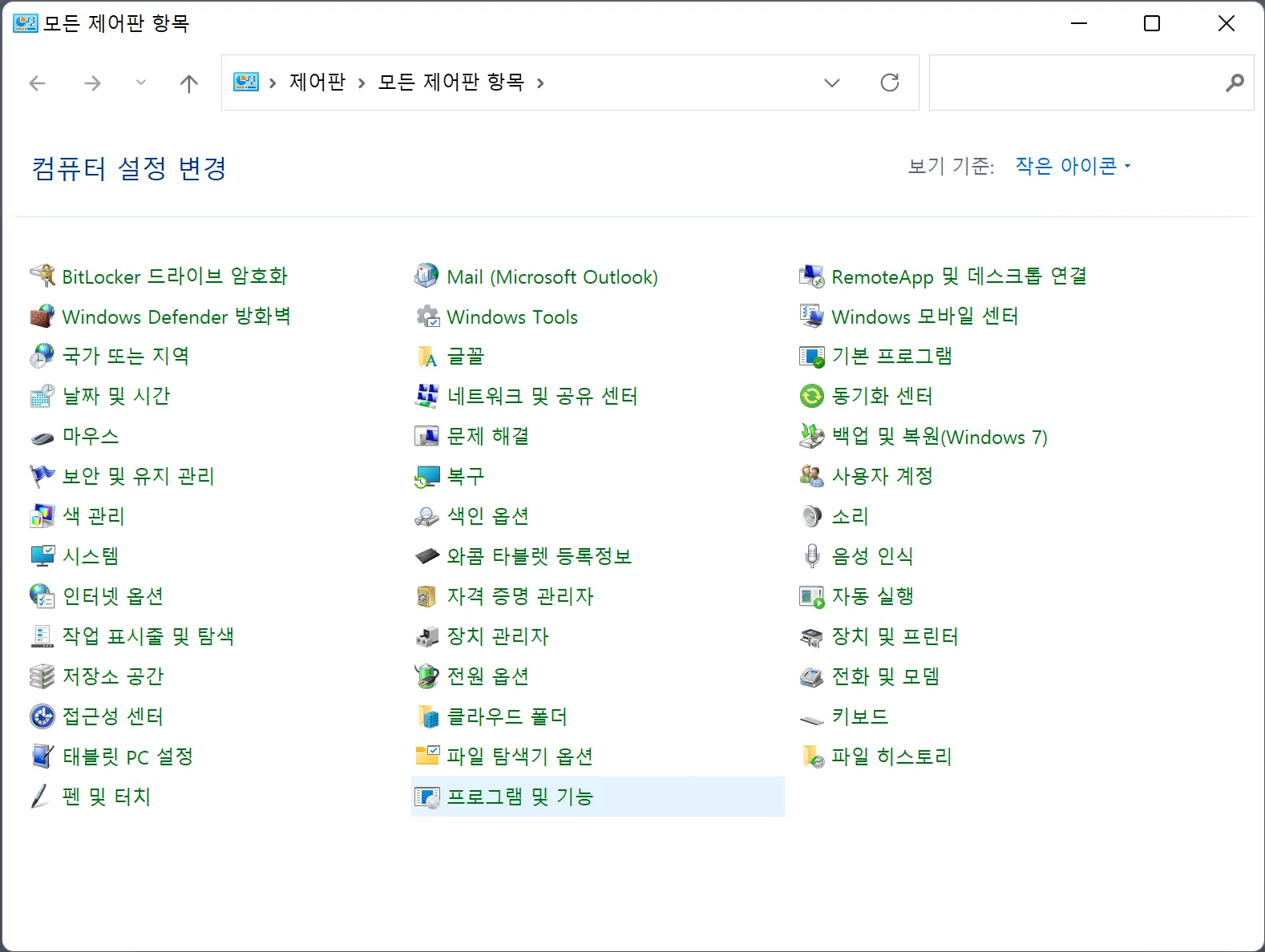 제어판 > 프로그램 및 기능 을 선택합니다.