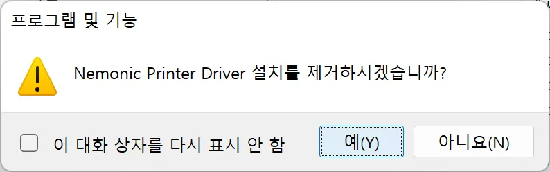 ② ‘Nemonic Printer Driver 설치를 제거하시겠습니까?’ 라는 메시지가 뜨면, ‘예’를 선택합니다.