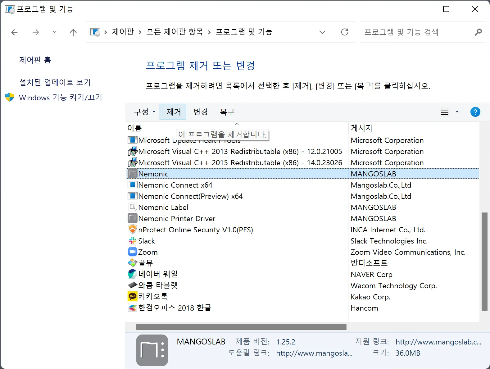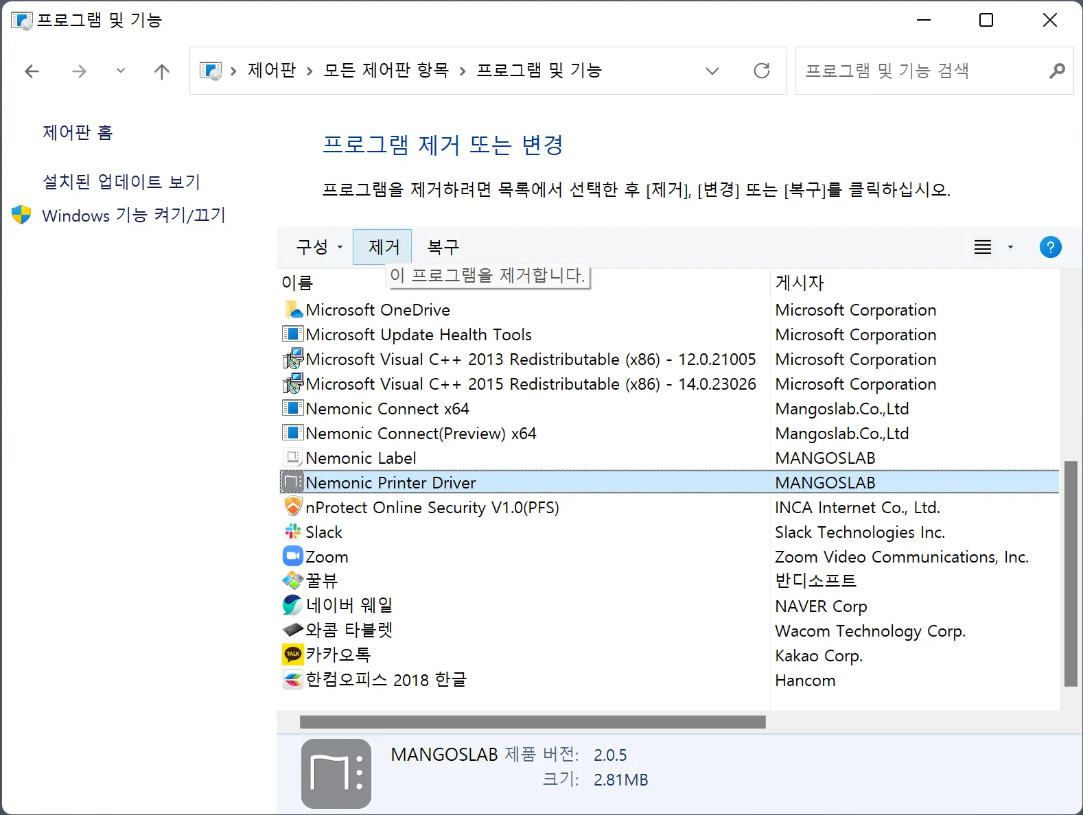 아래의 안내에 따라 Nemonic 프로그램과, Nemonic Printer Driver 프로그램을 삭제해주세요.