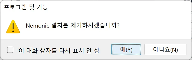 ② ‘Nemonic 설치를 제거하시겠습니까?’ 라는 메시지가 뜨면, ‘예’를 선택합니다.
