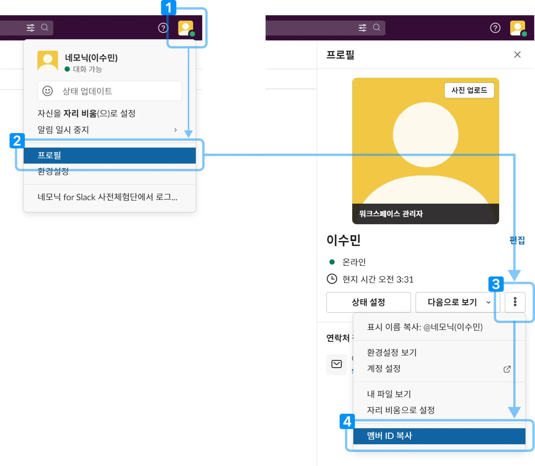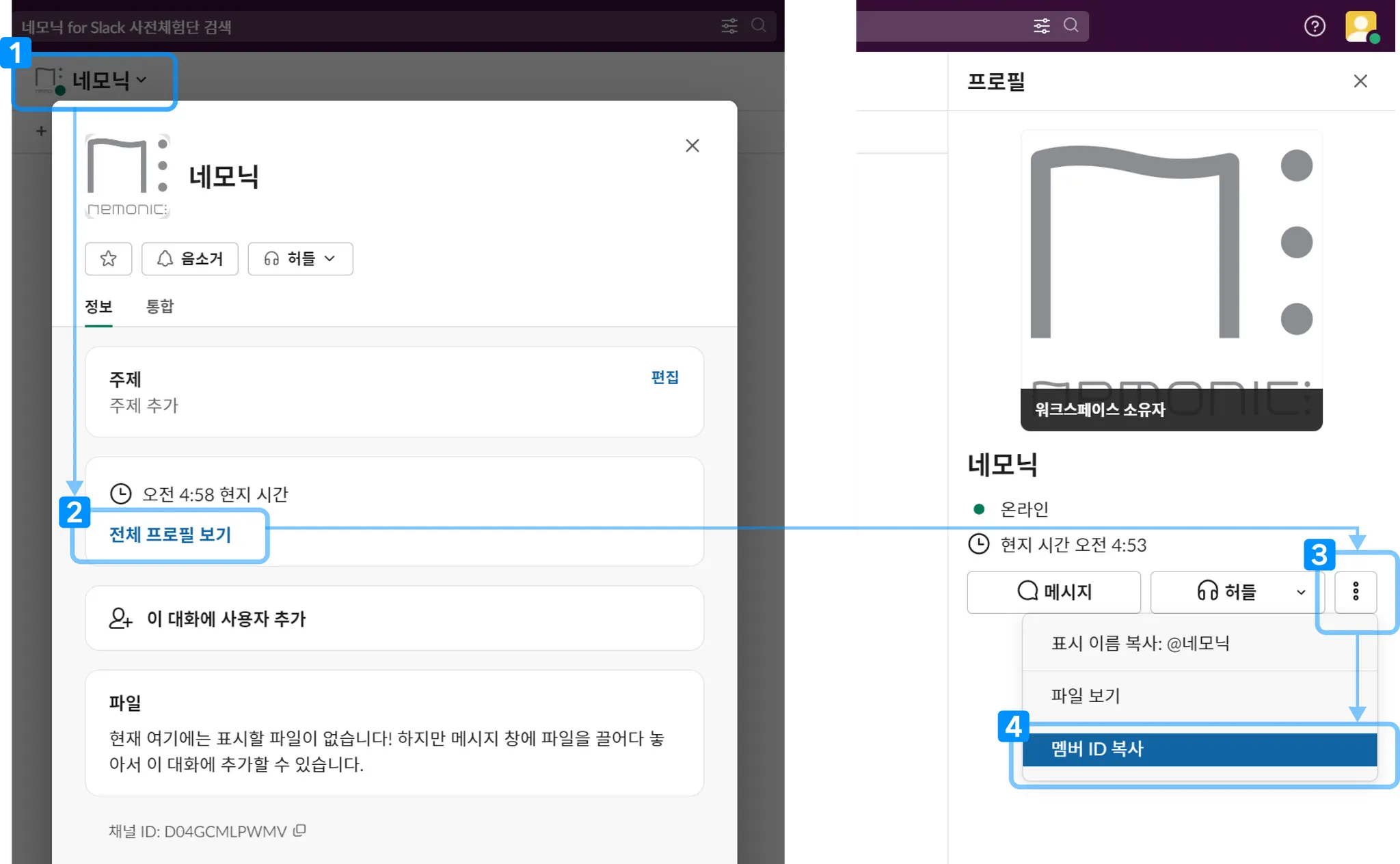 네모닉 앱을 설치한 워크스페이스에서 멤버ID를 확인해주세요.