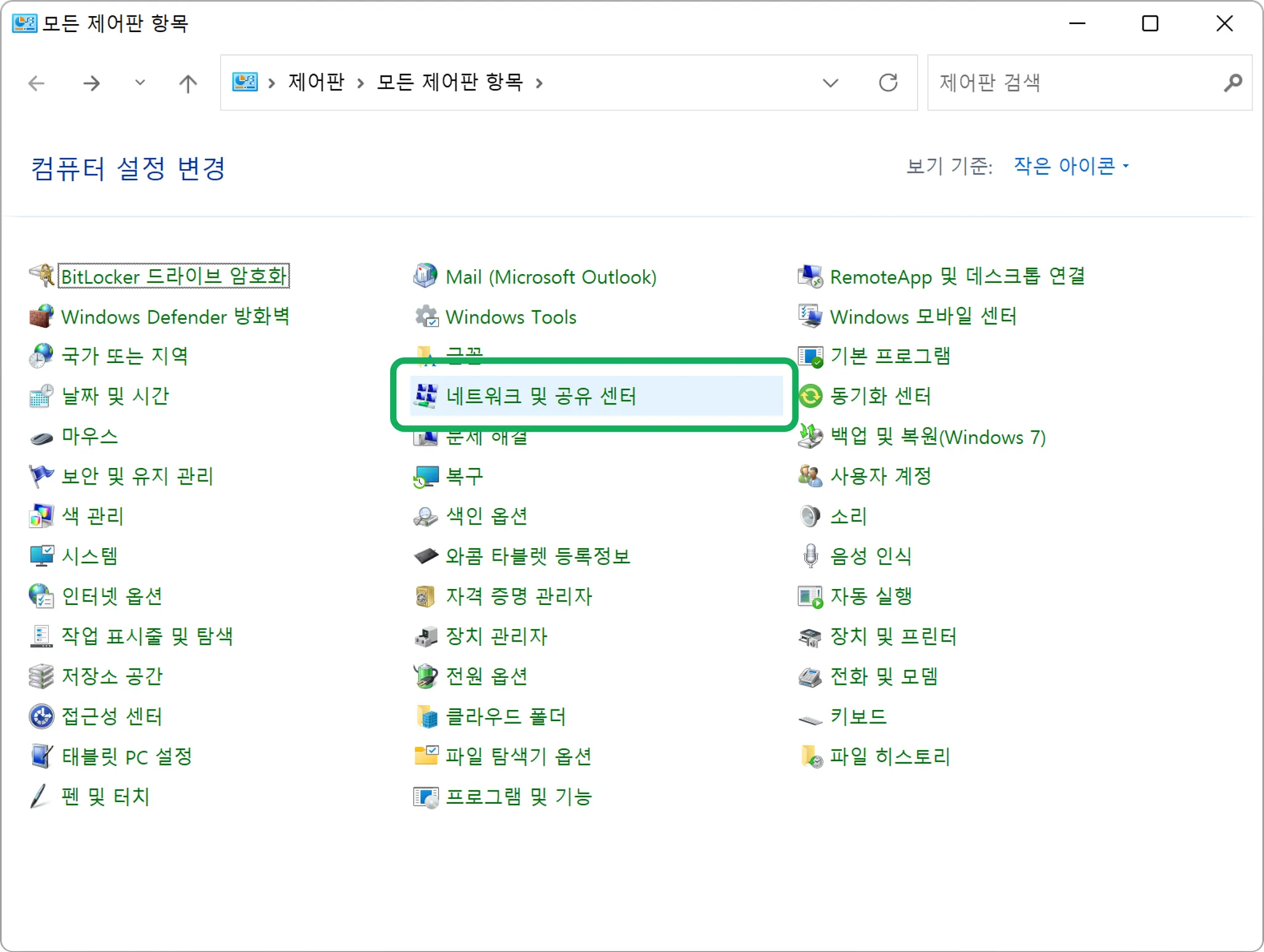 ▲ 제어판에서 네트워크 및 공유 센터 를 선택합니다.