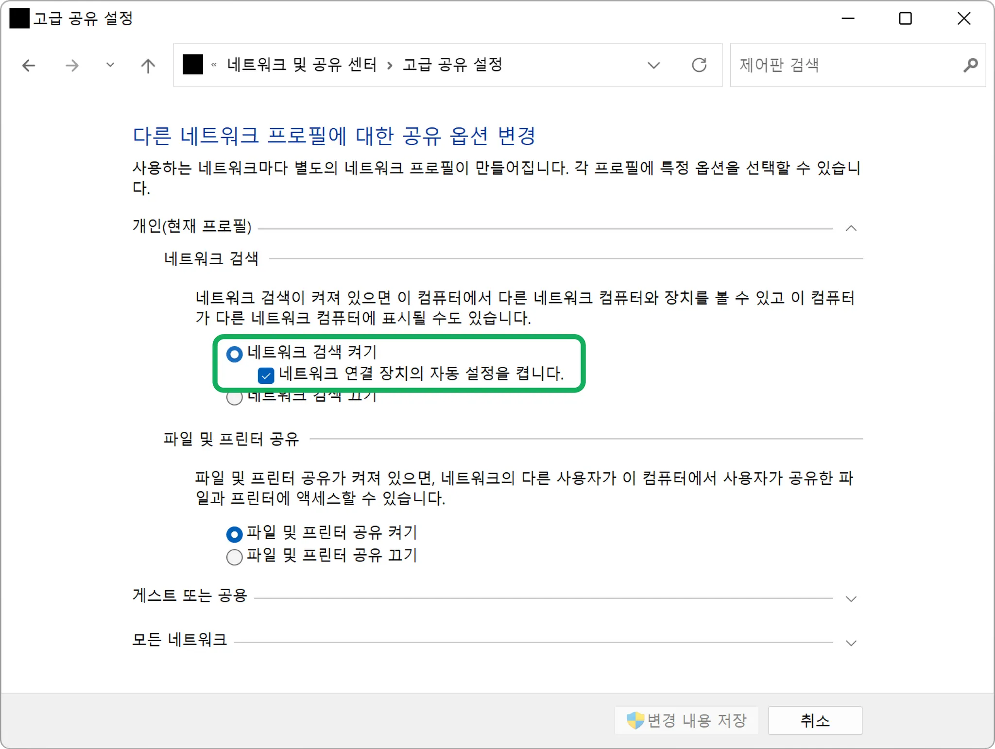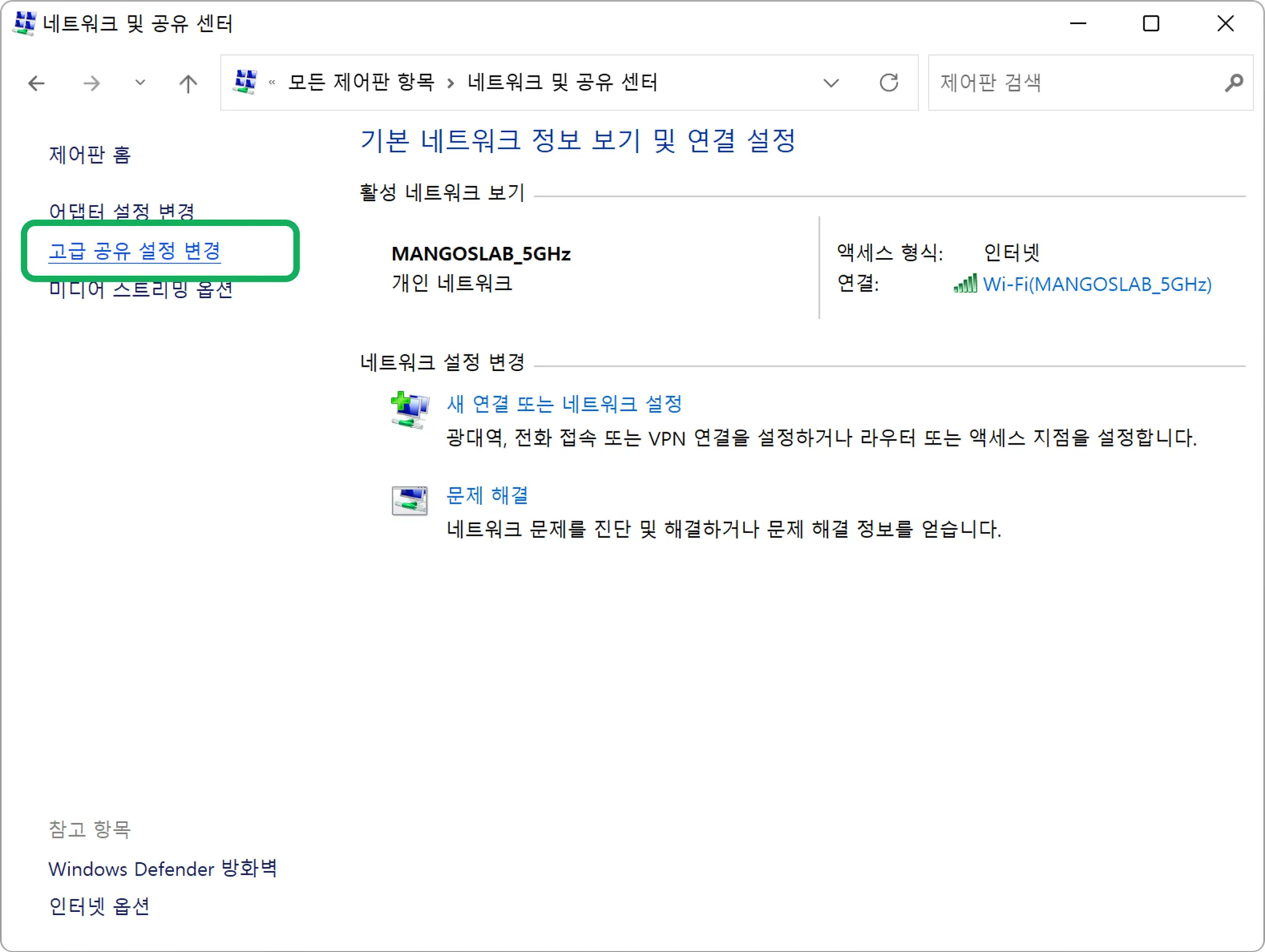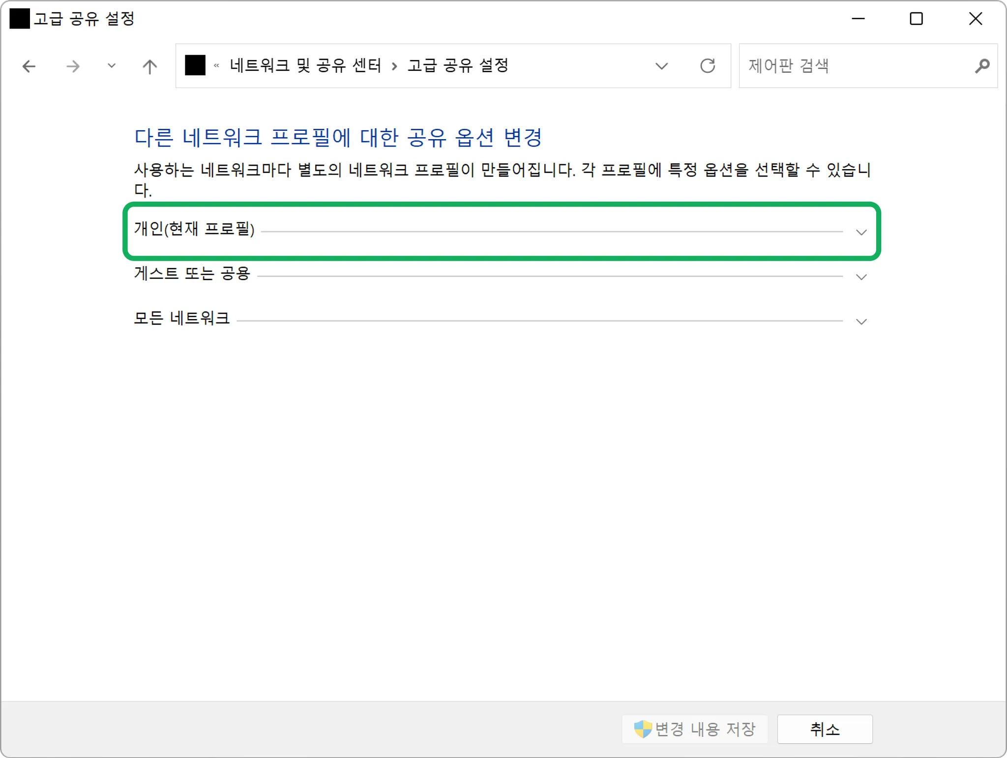 ▲ 고급 공유 설정 변경 을 선택합니다.