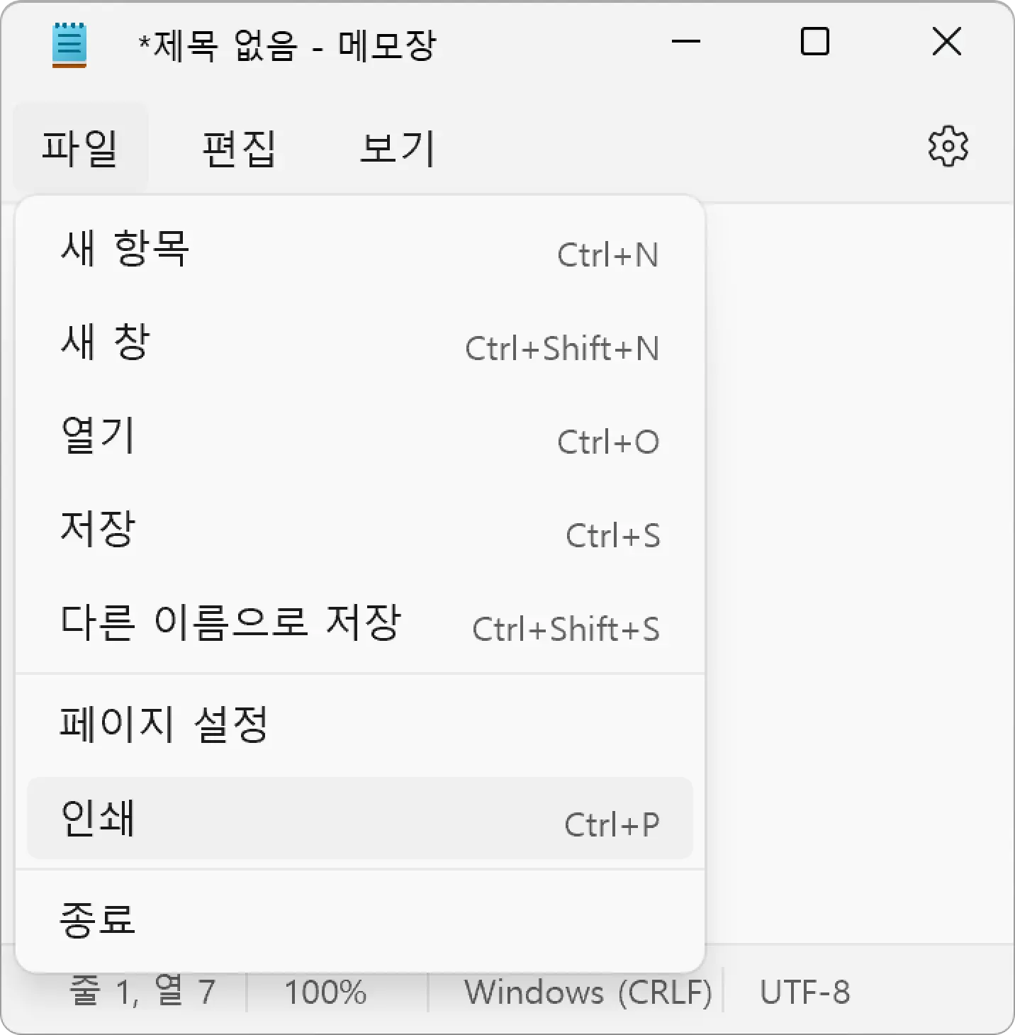 ▲ 파일 > 인쇄 를 선택하거나, Ctrl+P를 눌러 인쇄 창을 켜 주세요.