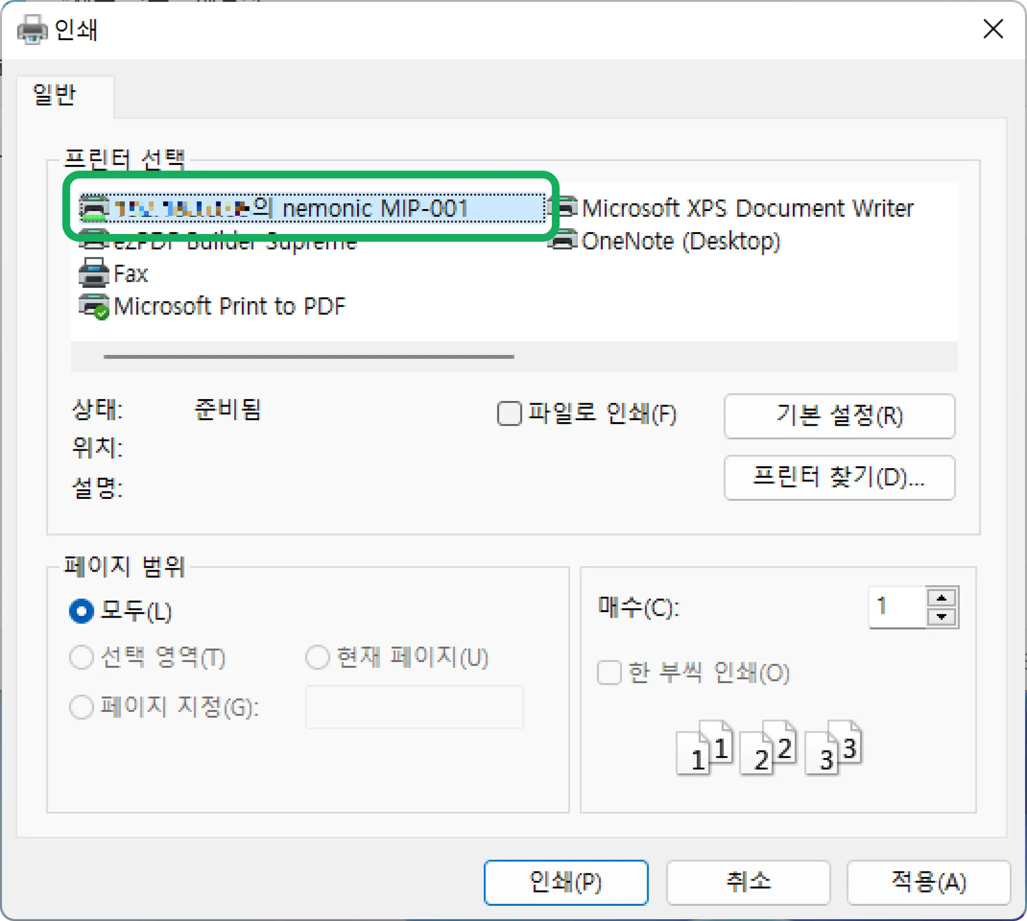 ▲ 프린터 목록에서, PC①에 연결된 네모닉을 선택하고 인쇄를 눌러주세요.