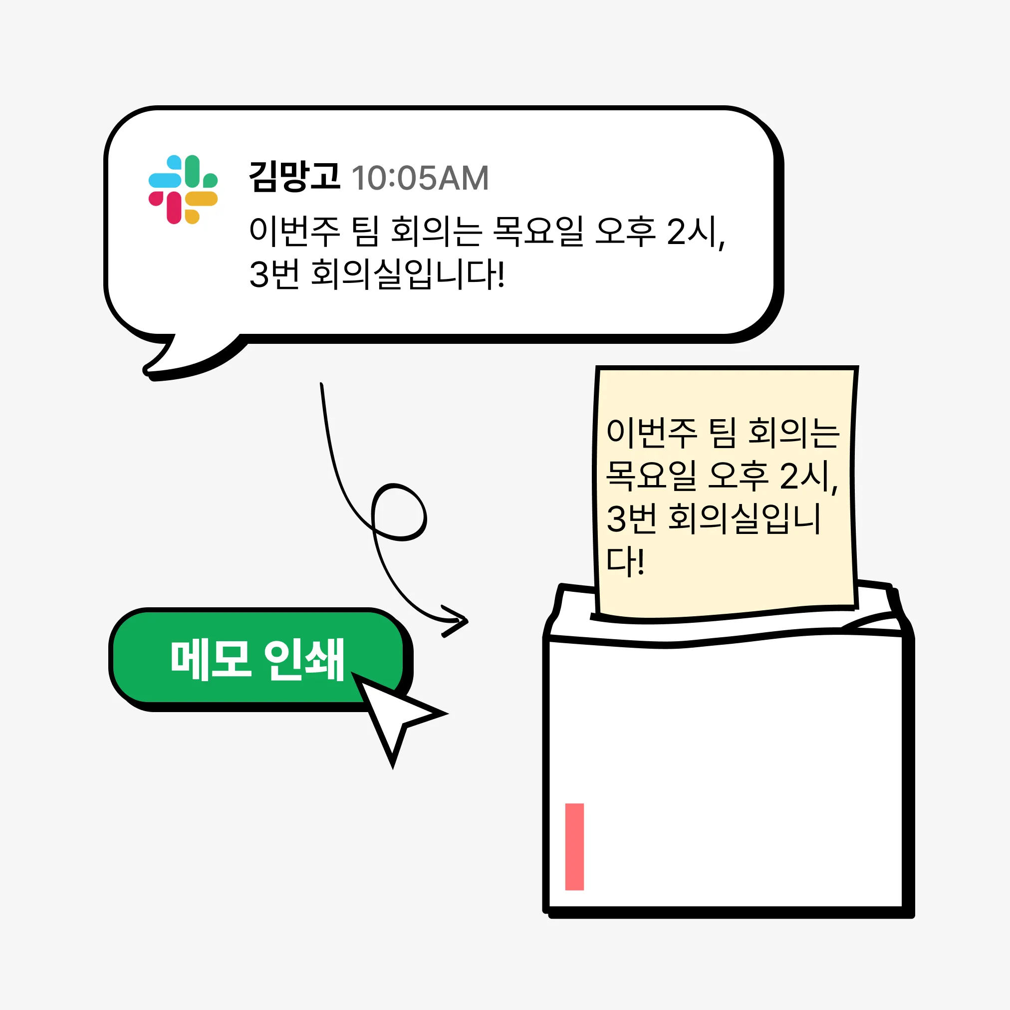 회사에서 슬랙 쓰시는 분이라면 공감이 가실거에요. 슬랙 메시지를 눈에 잘 띄는 점착메모로! 네모닉을 연동해 출력할수 있어요.